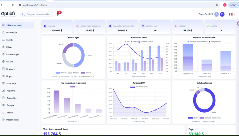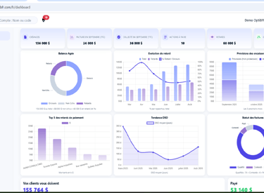 Vous accédez à un tableau de bord complet regroupant vos encours, vos retards, vos promesses de paiement et vos indicateurs de performance (DSO, balance âgée, prévisions de trésorerie).